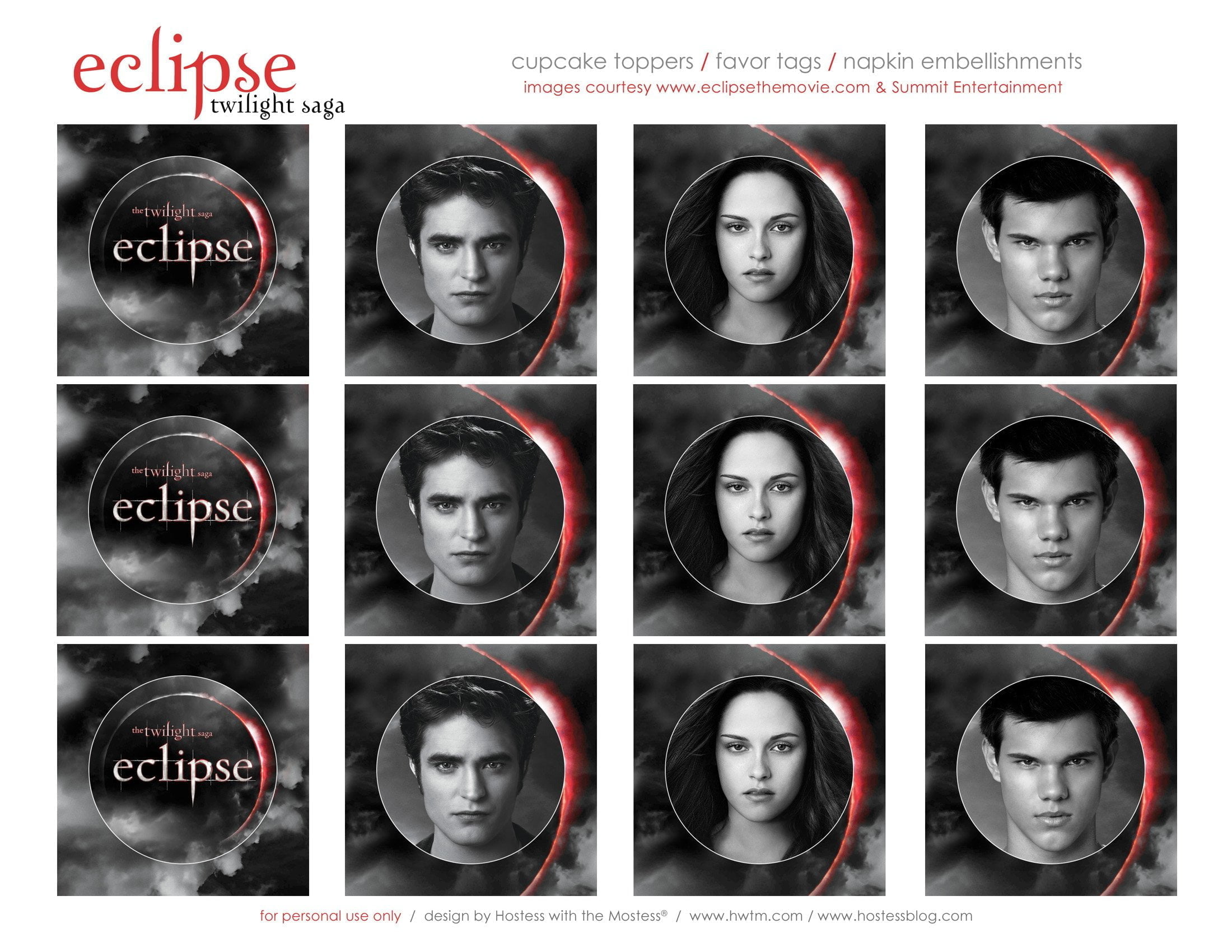 The images of the Twilight cast members incorporated into these original designs are courtesy of Summit Entertainment via www.eclipsethemovie.com and collider.com. As stated in clause 2B of their terms and conditions, these images may be used for personal use only: “(b) License. We grant you a nonexclusive, nontransferable, revocable, limited license to view, download, copy, and print Content retrieved from the Site only for your personal, non-commercial use.”