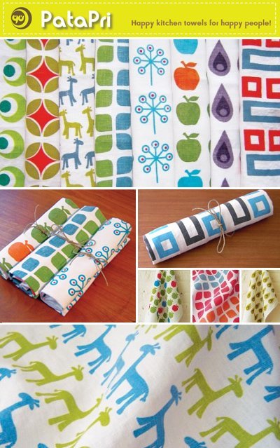 These silk-screened “happy kitchen towels” from PataPri come in ultra-modern patterns and fun, vibrant colors! All towels are hand-printed by designer Yuko Uemura and available for purchase in her Etsy shop. I’m especially loving the kirin (giraffe) and apple prints…and thinking they would look just as good framed on the wall as hanging in the kitchen!