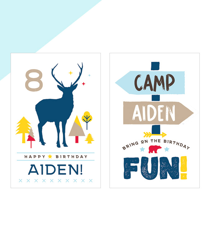 My Camping Birthday Party theme features playful tents, campfires, woodland animals, and trees, illustrated in a bright & modern style with handcrafted charm. The palette and artwork feel adventurous and fun, with a design-forward look that still feels kid-friendly!