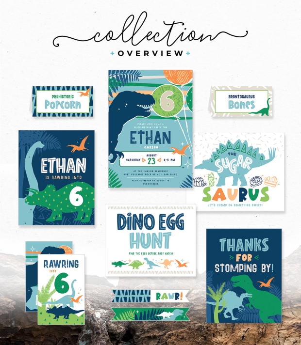 My Dinosaur birthday party theme features bold dinosaurs, prehistoric plants, and modern mudcloth-inspired patterns in a playful, graphic palette. Clean layouts and confident color pairings give this collection a contemporary edge while staying kid-forward and fun!